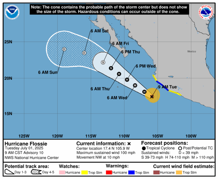 A las 6:00 horas, el centro del huracán se ubicaba a 250 kilómetros al sur-suroeste de Manzanillo. Conagua prevé que hacia el mediodía Flossie se mantenga como huracán categoría 2 a 255 kilómetros de Playa Pérula, Jalisco.