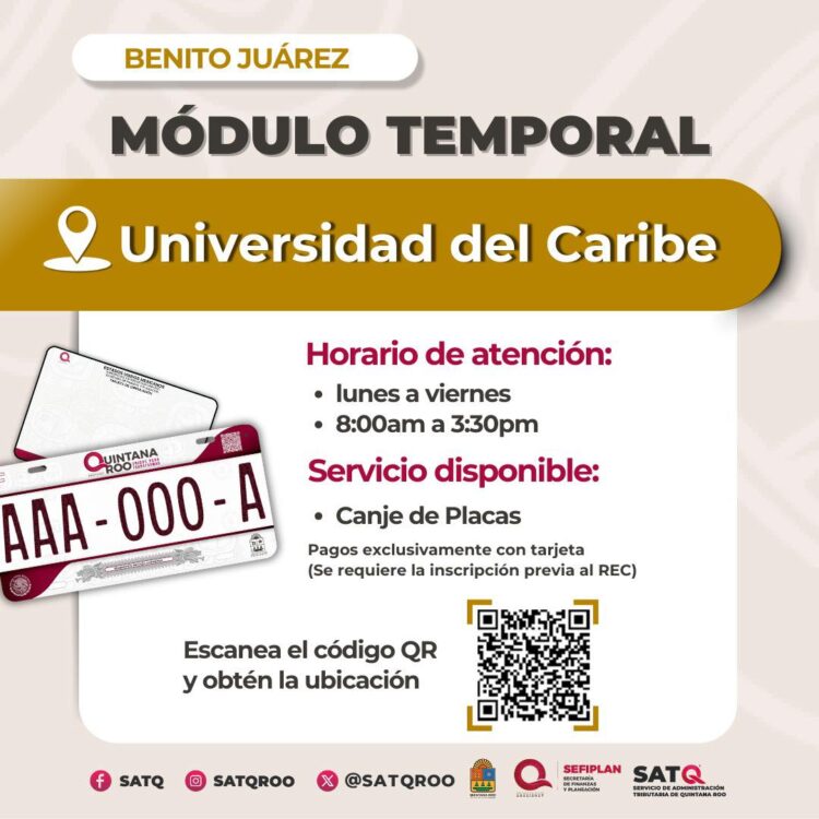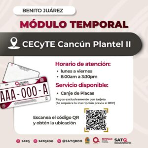 CANCÚN.- La Secretaría de Finanzas y Planeación del Estado (SEFIPLAN), a través del Servicio de Administración Tributaria de Quintana Roo (SATQ), informó la apertura de módulos temporales adicionales en el municipio de Benito Juárez para facilitar el canje de placas vehiculares 2026.