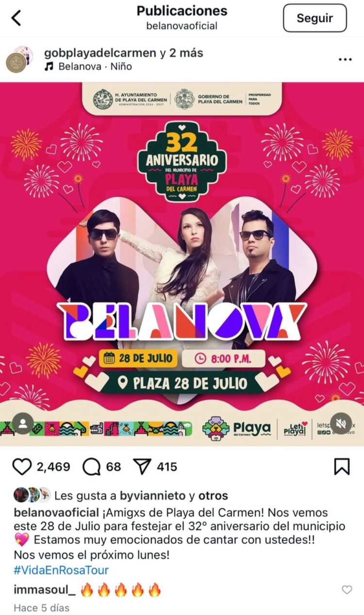 PLAYA DEL CARMEN.- El concierto de Belanova con motivo del 32 aniversario de Playa del Carmen no ha sido cancelado, aclararon autoridades municipales ante la difusión de información falsa que ha circulado en redes sociales en las últimas horas.