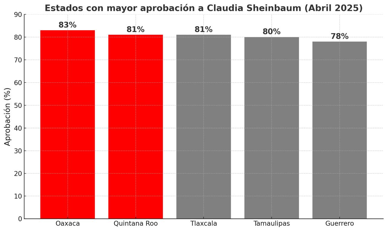 De acuerdo con el estudio correspondiente al mes de abril de 2025, la presidenta alcanza una aprobación de 83% en Oaxaca y 81% en Quintana Roo, cifras que colocan a ambas entidades a la cabeza del ‘ranking’ nacional.