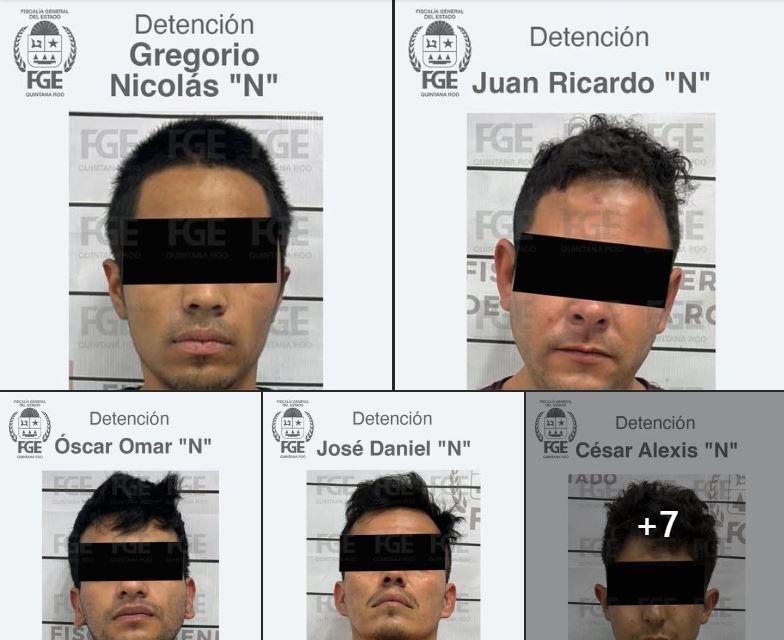 Tras su detención, los siete masculinos fueron puestos a disposición de la autoridad correspondiente; en el término constitucional previsto definirán su situación jurídica. (Fuente: FGE. Comunicado 205/2025-FDC. Playa del Carmen, Quintana Roo, 18 de noviembre de 2025)