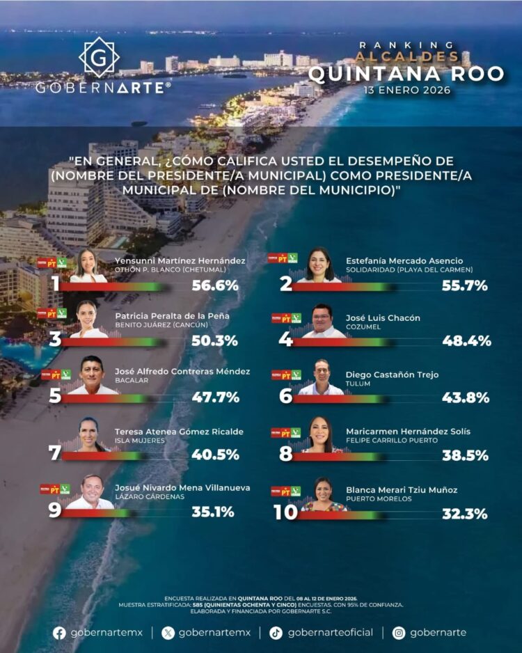 CHETUMAL.- La presidenta municipal de Othón P. Blanco, Yensunni Martínez Hernández, sorprendió al iniciar este 2026 como la alcaldesa mejor evaluada de todo Quintana Roo, al encabezar la encuesta de medición de desempeño elaborada por la organización GoberArte.
