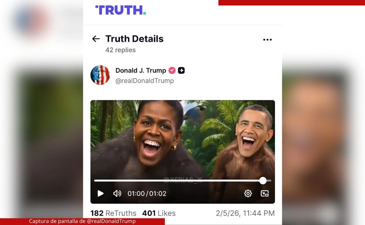 El presidente publicó en Truth Social este jueves un video de poco más de un minuto en el que vertía teorías conspirativas sobre las elecciones y en el que al final aparecen los Obama con sus rostros sobrepuestos en cuerpos de monos, con unas palmeras de fondo.
