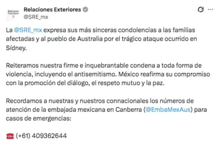 Expresó sus más sinceras condolencias a las familias afectadas, así como al pueblo de Australia por trágico ataque ocurrido en Sídney. Relaciones Exteriores recordó a los connacionales los números de atención de la embajada mexicana en Canberra para casos de emergencias: (+61) 409362644.