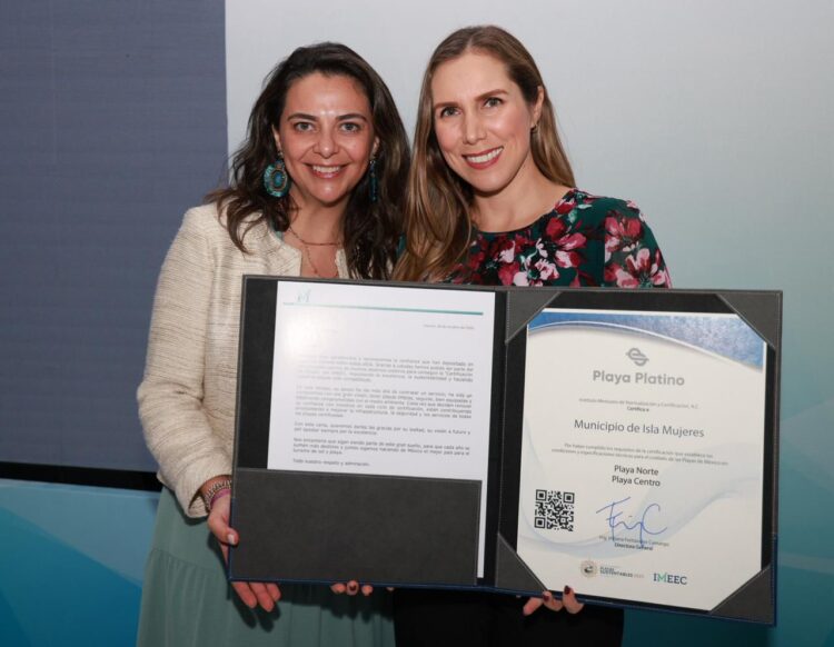 ISLA MUJERES.- El Gobierno Municipal de Isla Mujeres, encabezado por la caldeada Atenea Gómez Ricalde, recibió por tercer año consecutivo la certificación Playa Platino para Playa Norte y Playa Centro, otorgadas por el Instituto Mexicano de Normalización y Certificación A.C. (IMNC).