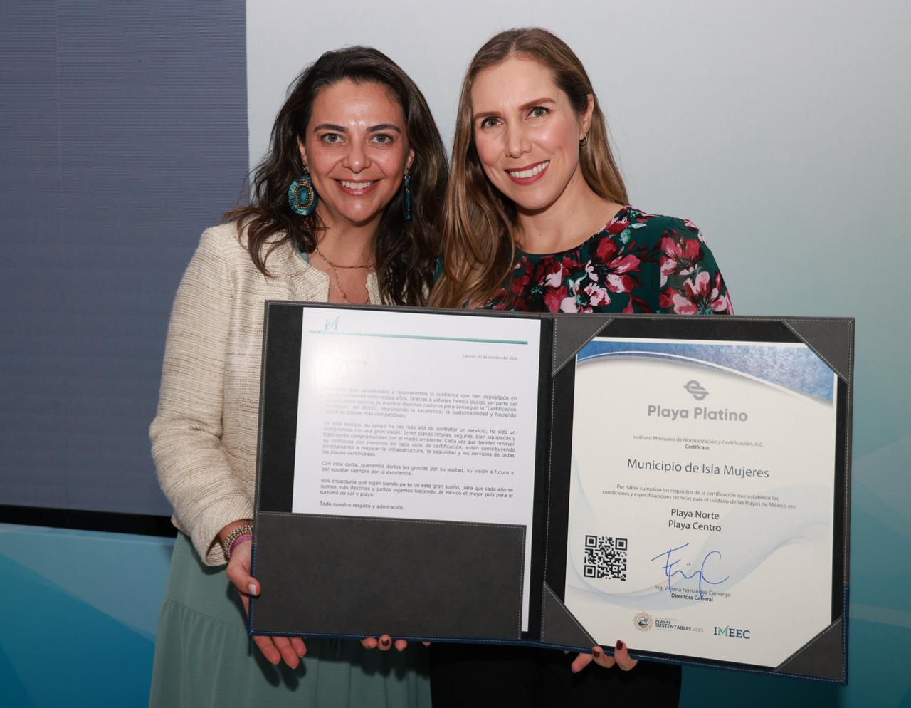 La Directora General del IMNC, Viviana Fernández Camargo, fue la encargada de entregar las certificaciones a la alcaldesa isleña, reconociendo el esfuerzo constante del municipio por mantener altos estándares de limpieza, sostenibilidad y manejo responsable de sus recursos naturales.