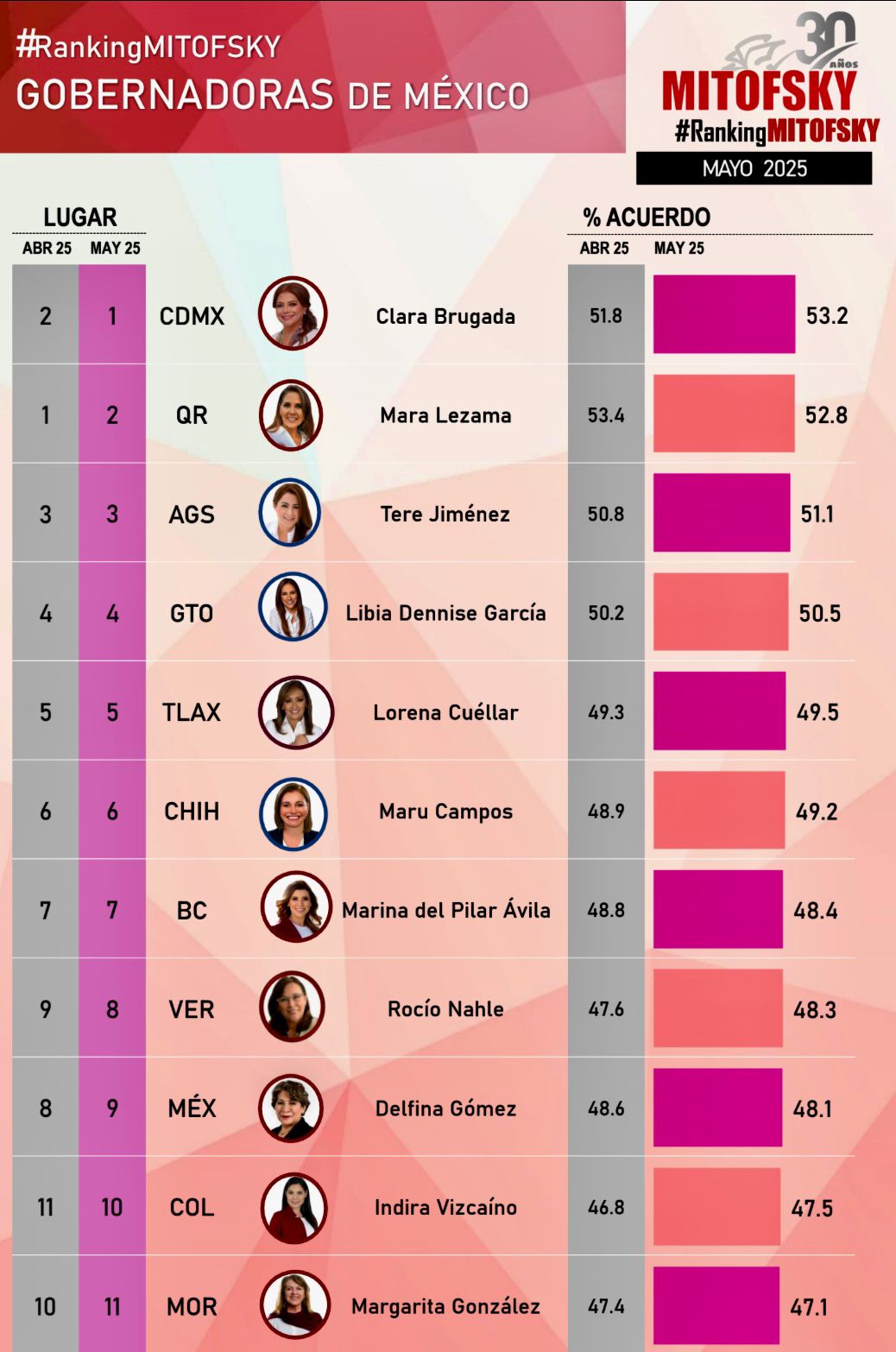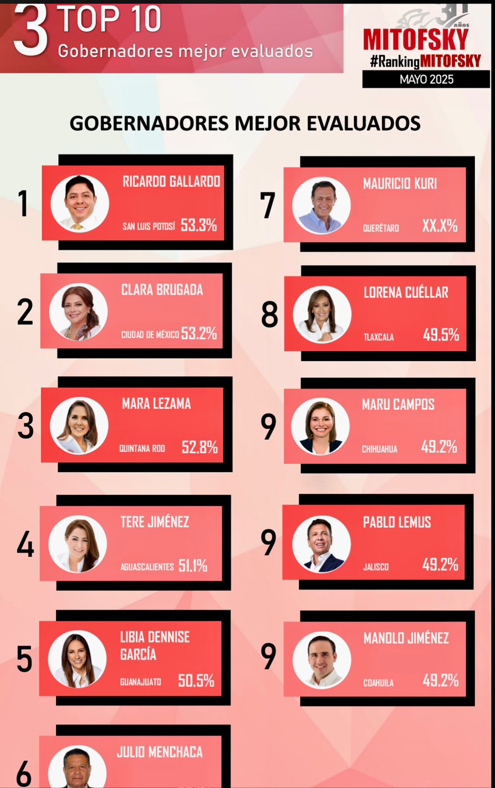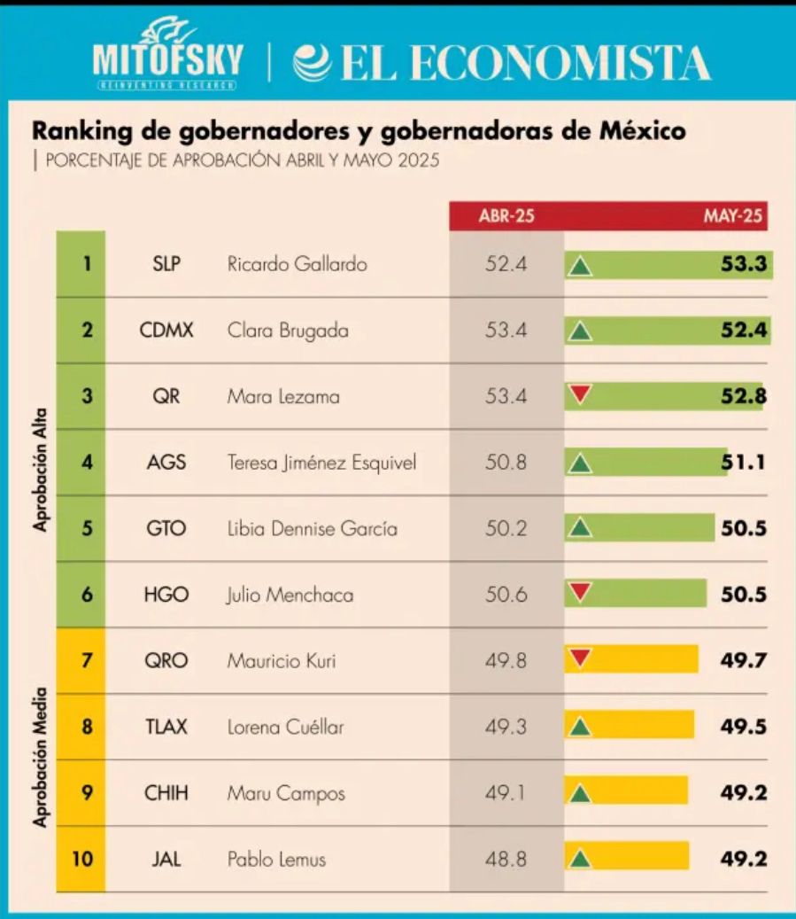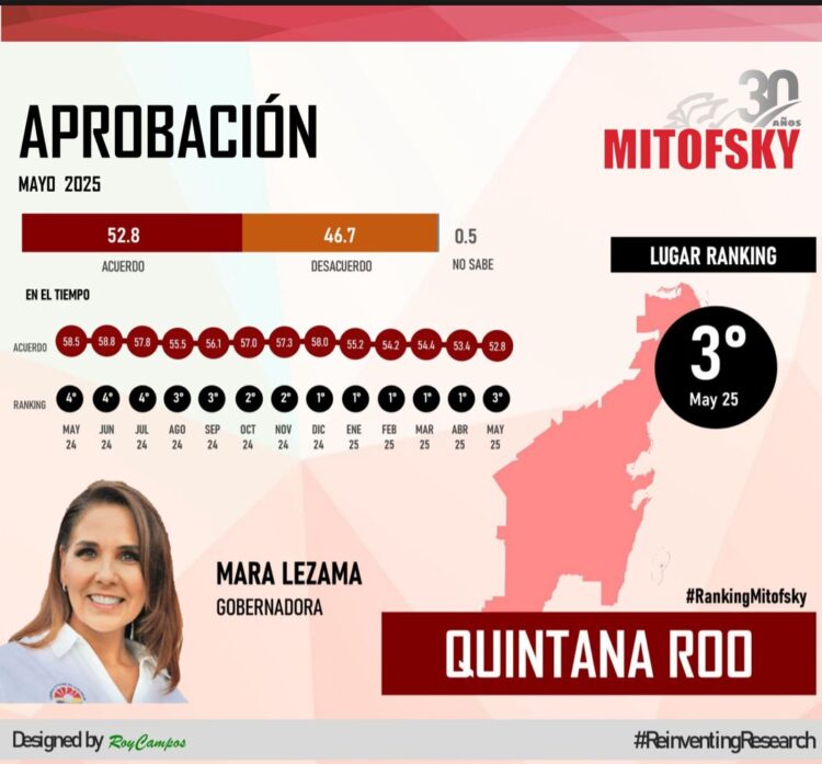 De acuerdo con el más reciente Ranking Mitofsky publicado por el diario El Economista, correspondiente al mes de mayo de 2025, la gobernadora de Quintana Roo, Mara Lezama, se posiciona como la tercera mandataria estatal con mayor aprobación ciudadana en todo México, con un 52.8% de respaldo.