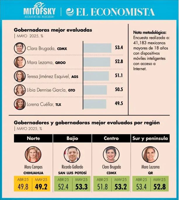 En el comparativo por género, Mara Lezama destaca como la segunda gobernadora mejor evaluada, únicamente por detrás de Brugada. En el grupo de las cinco mujeres con mayor aprobación aparecen también Tere Jiménez (Aguascalientes), Libia Dennise García (Guanajuato) y Lorena Cuéllar (Tlaxcala), todas por debajo del porcentaje de Lezama.