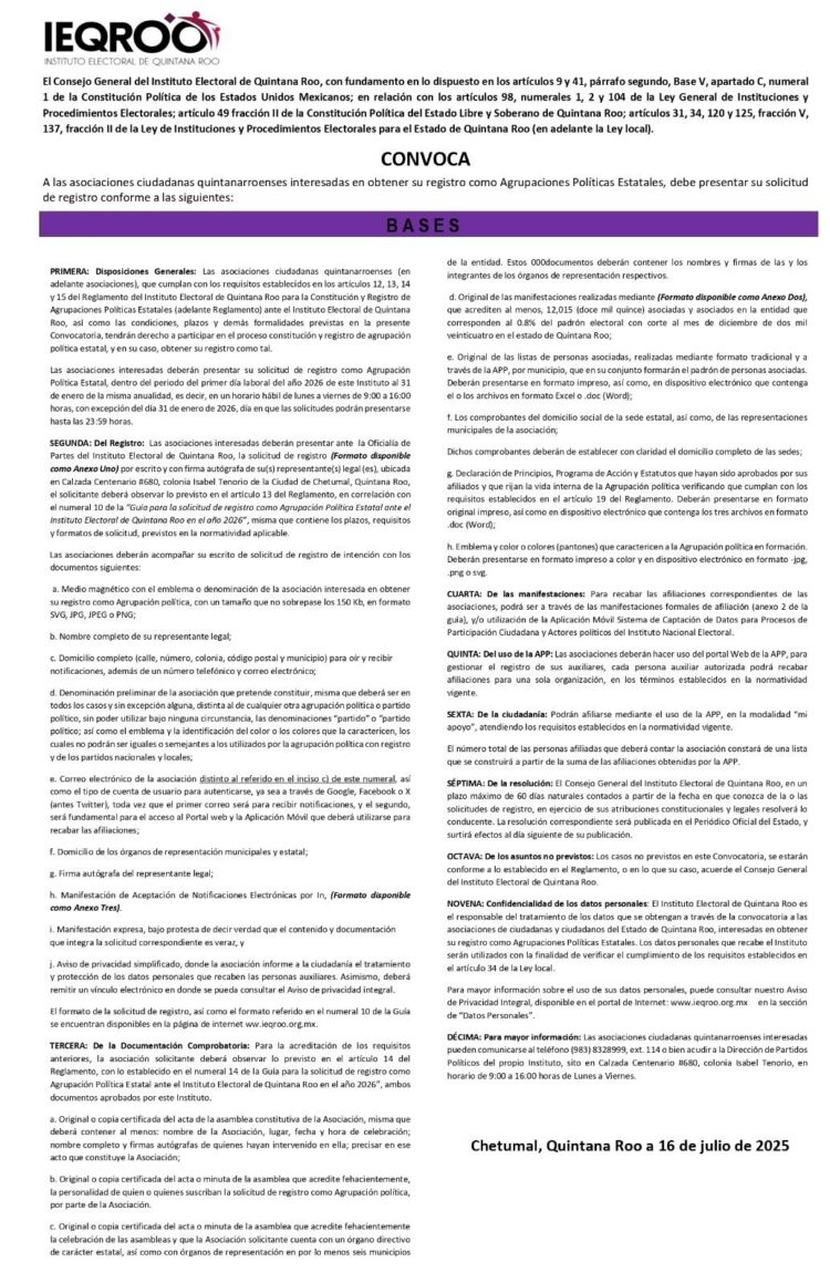 El IEQROO invita a las asociaciones interesadas a consultar los requisitos completos y a acercarse con oportunidad a sus instalaciones o canales oficiales para cualquier duda o aclaración sobre el procedimiento.