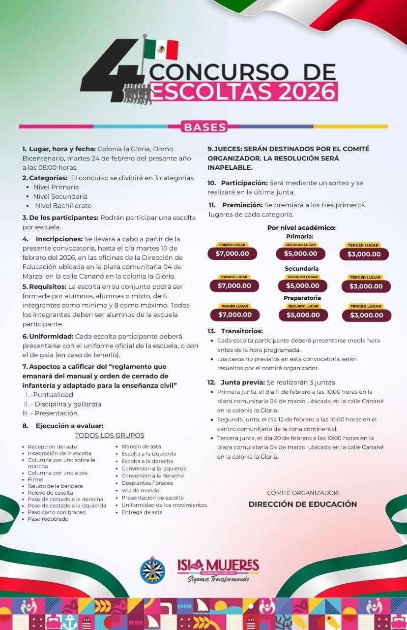 El Concurso de Escoltas 2026 representa una oportunidad para reconocer el trabajo de las escuelas y para seguir construyendo un Isla Mujeres con orden, identidad y oportunidades para todas y todos.