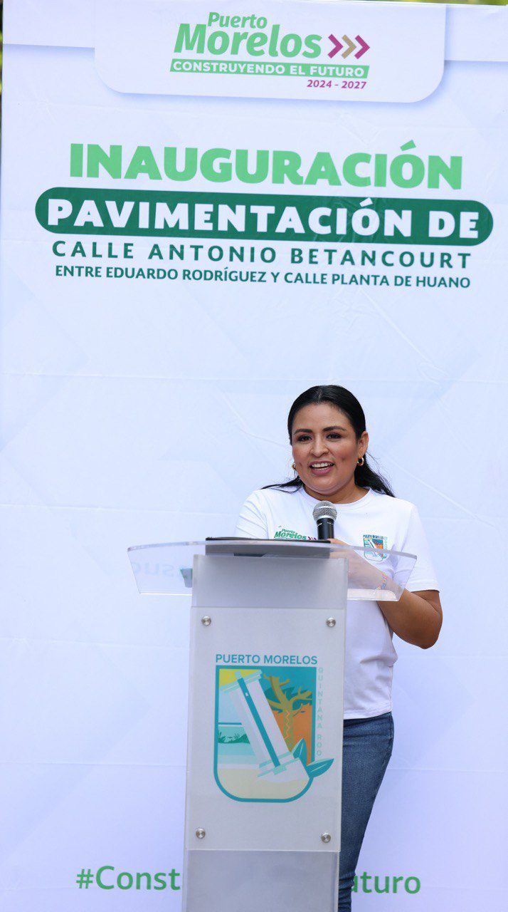 PUERTO MORELOS.- La presidenta municipal Blanca Merari Tziu Muñoz cumplió un compromiso más con la comunidad de Leona Vicario al entregar la pavimentación de la calle Antonio Betancourt, entre Eduardo Rodríguez y Planta de Huano. La obra, que representó una inversión de 2.4 millones de pesos, abarcó 237 metros lineales y mil 185 metros cuadrados de superficie pavimentada.
