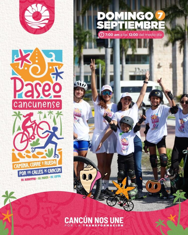 CANCÚN.- Como cada mes, el Ayuntamiento de Benito Juárez llevará a cabo la jornada dominical de “Paseo Cancunense”, un programa que promueve una experiencia única de movilidad activa, deporte, cultura y convivencia comunitaria, desde las 7:00 a las 12:00 horas en las avenidas Bonampak, Uxmal y Nader.