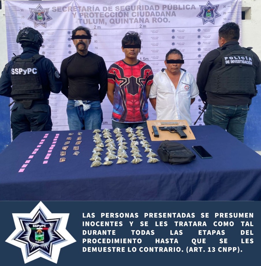 TULUM.- Un operativo conjunto entre la Secretaría de Seguridad Pública y Protección Ciudadana y la Fiscalía General del Estado derivó en la detención de tres personas en la colonia Centro, por su presunta participación en delitos contra la salud y violación a la Ley Federal de Armas de Fuego y Explosivos.