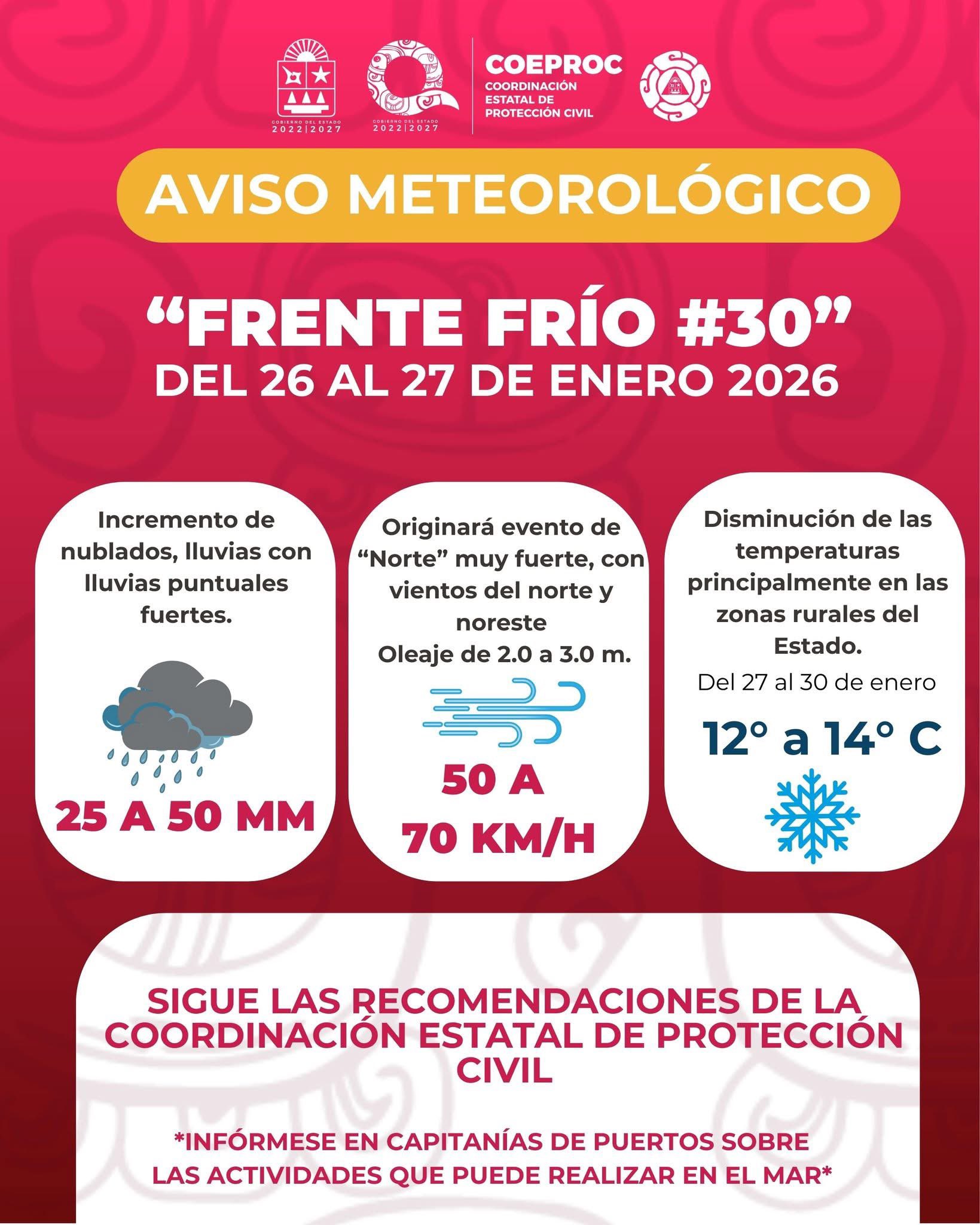 Quintanarroenses, debido al acercamiento y desplazamiento del Frente Frío número 30, a la porción norte de la Península de Yucatán y del Estado de Quintana Roo, se pronostica: