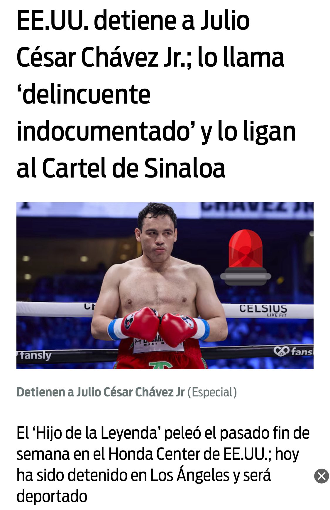 Estados Unidos detuvo este jueves a Julio César Chávez Jr., hijo de la leyenda del boxeo mexicano, Julio César Chávez, por estar ilegalmente en su territorio y por sus presuntos vínculos con el Cártel de Sinaloa.