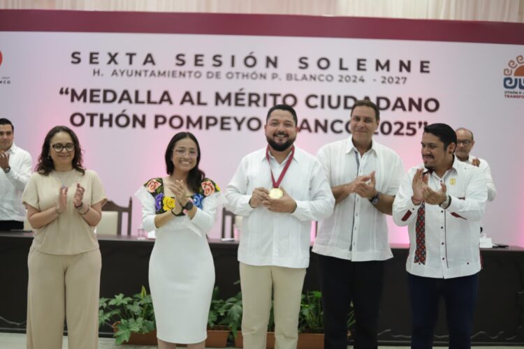 CHETUMAL.- La presidenta municipal de Othón P. Blanco, Yensunni Martínez Hernández, entregó a Óscar Moreno Castillo la Medalla al Mérito Ciudadano “Othón Pompeyo Blanco” 2025, chetumaleño de gran corazón y un firme compromiso con la Transformación del municipio.