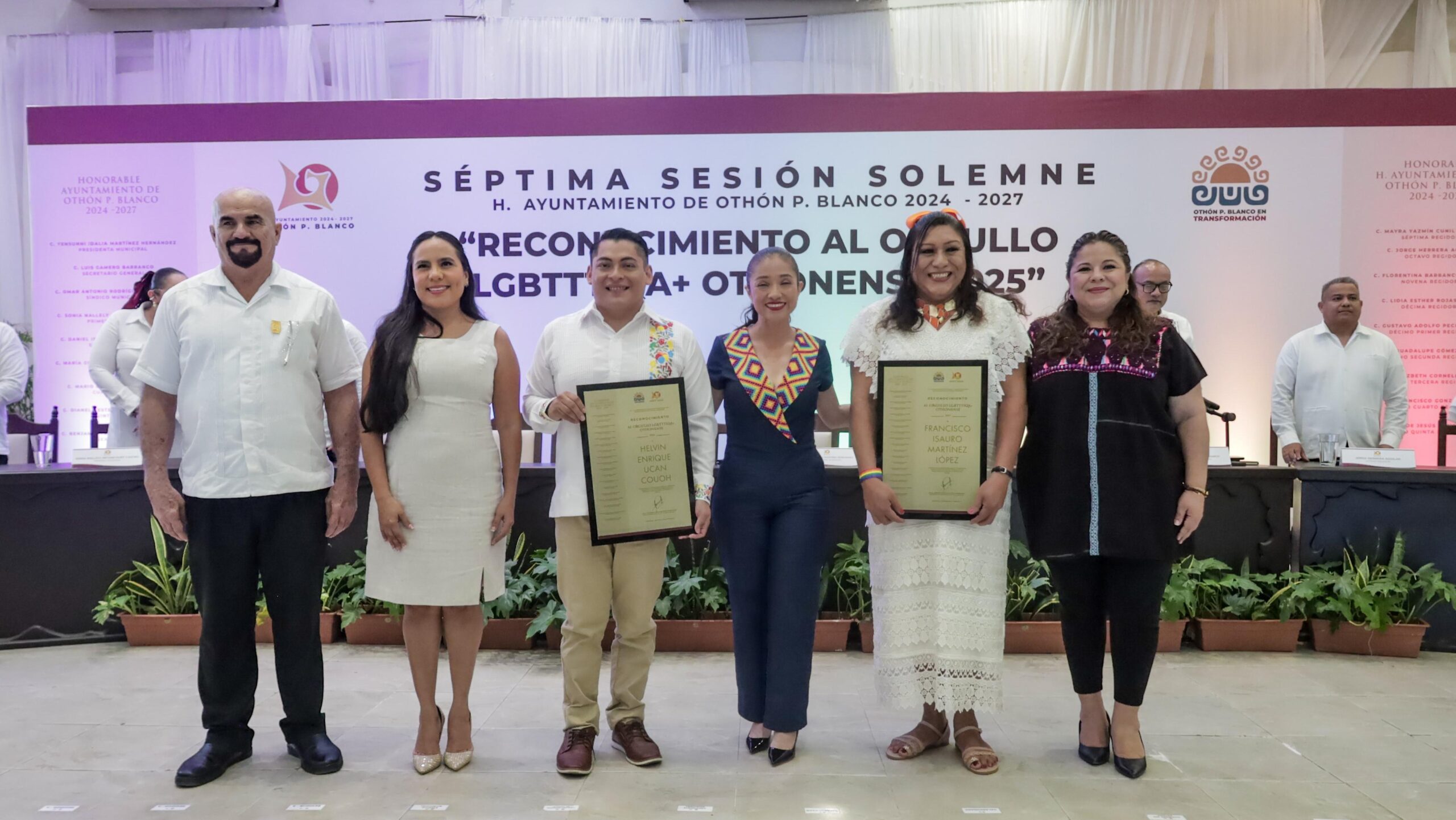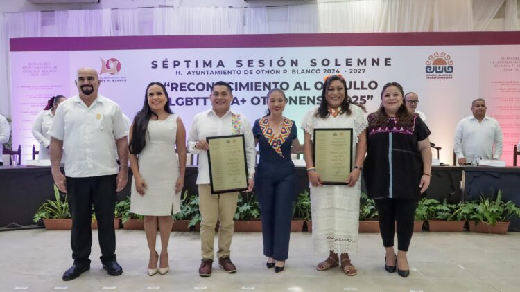 CHETUMAL.- En el marco del Mes del Orgullo y en lo que fue la Séptima Sesión Solemne del Ayuntamiento de Othón P. Blanco, la presidenta municipal Yensunni Martínez Hernández entregó a “Ivana Bustamante” y a “Francis Show” el Reconocimiento al Orgullo LGBTTTIQA+ Othonense 2025, en honor a su destacada labor altruista y constante compromiso en pro del respeto de los derechos humanos de la diversidad sexual.