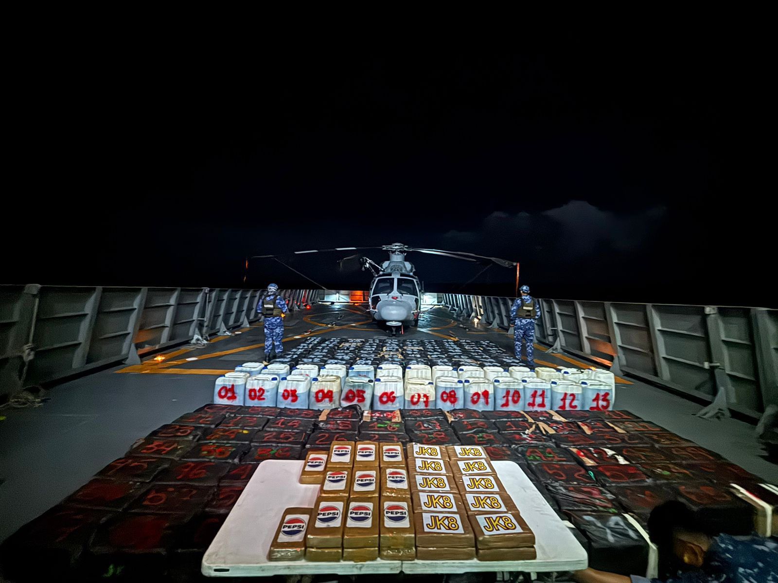 CDMX.- Durante operaciones de patrulla de vigilancia marítima, se logró el aseguramiento de aproximadamente 8.3 toneladas de presunta carga ilícita y la detención de 23 probables transgresores de la ley; lo que representa la mayor cantidad de droga asegurada en una operación marítima, sin precedentes en la historia de la Institución.