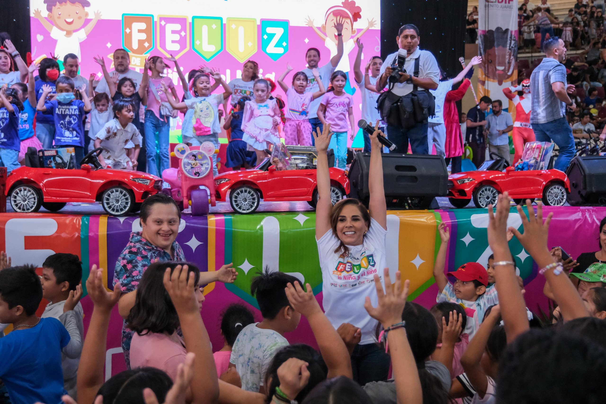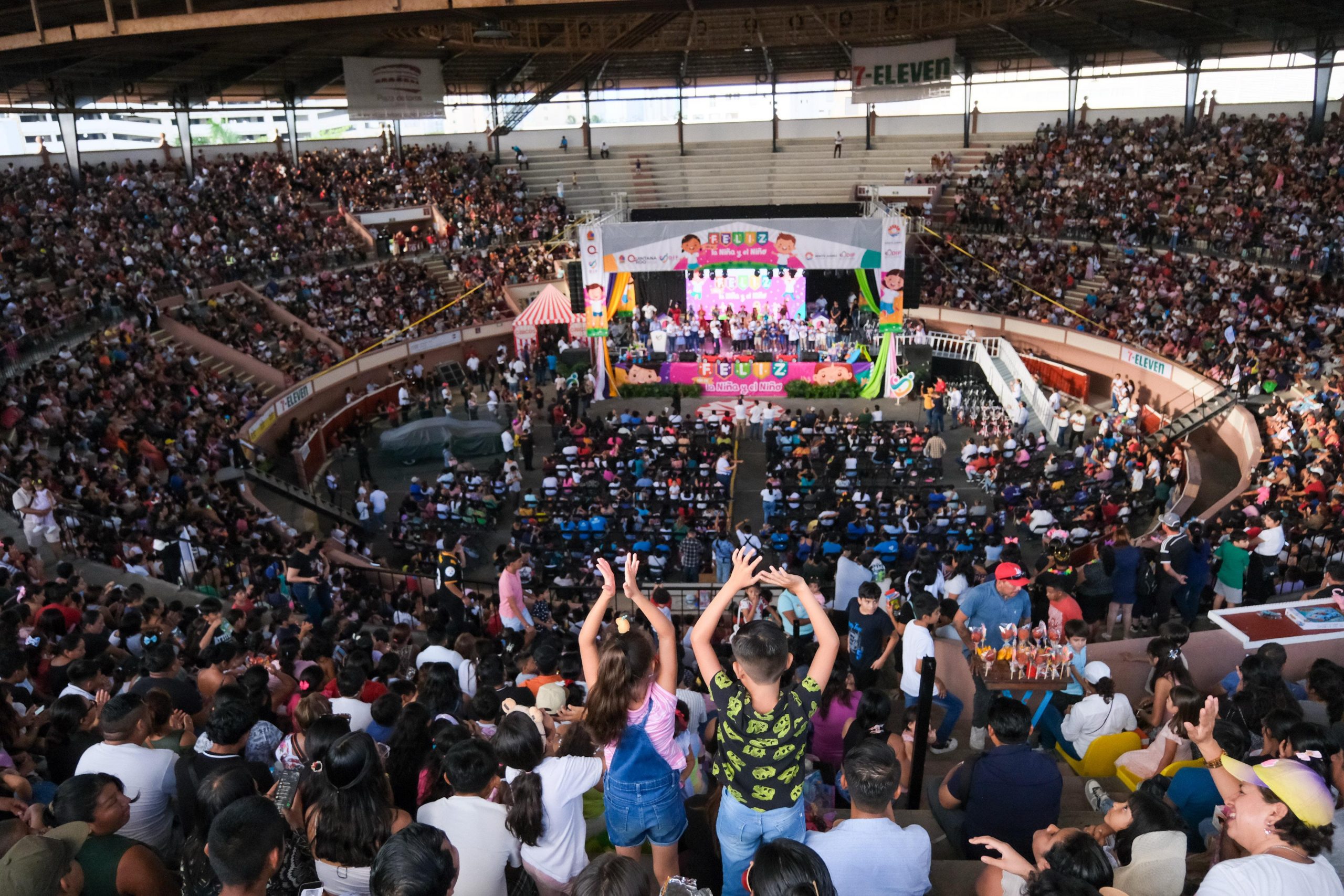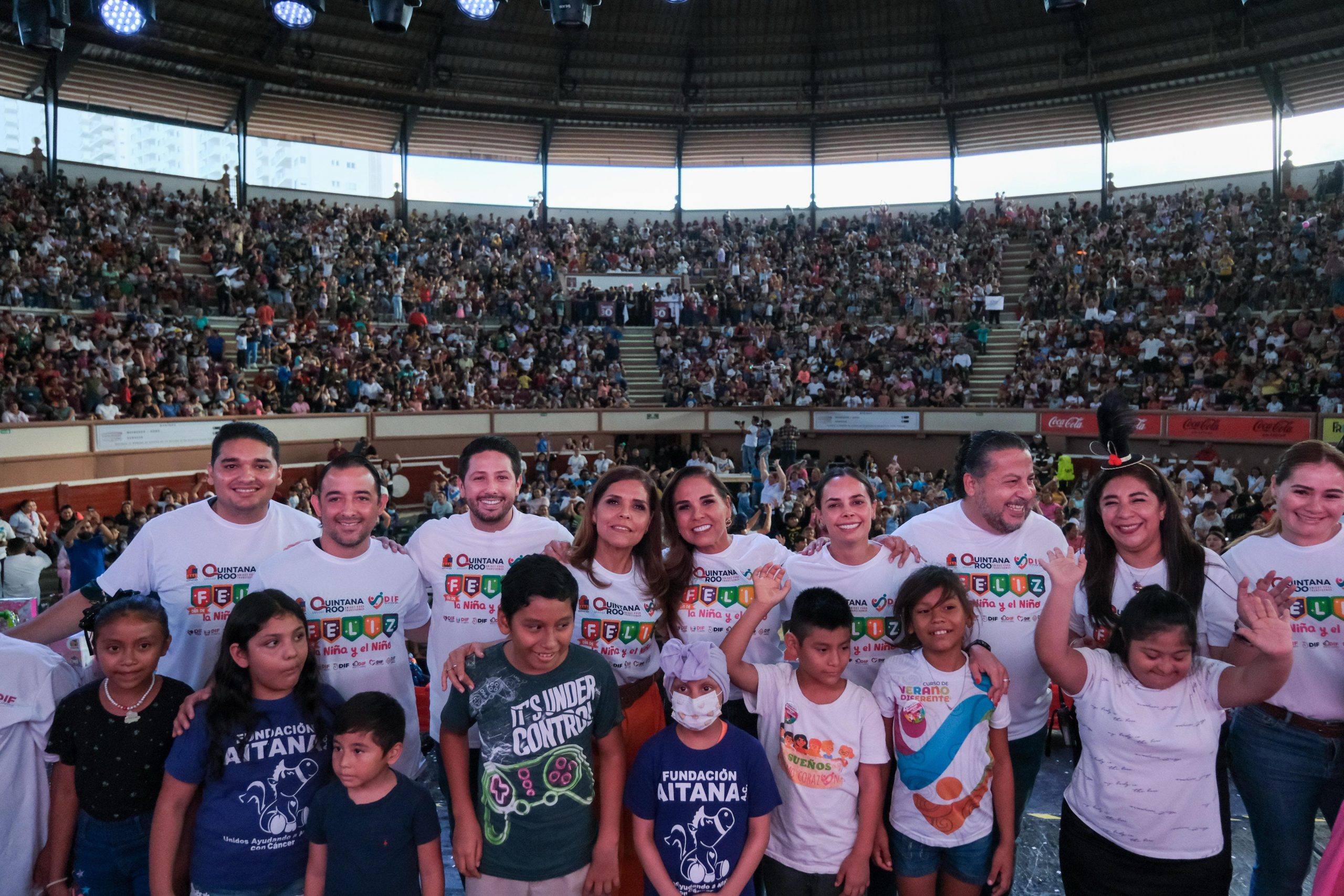 CANCÚN.- La gobernadora Mara Lezama Espinosa, junto a la presidenta honoraria del Sistema DIF Quintana Roo, Verónica Lezama Espinosa, y la presidenta municipal, Ana Paty Peralta, celebraron a la niñez acompañados de sus familias el “Día de la Niña y el Niño”, en la Plaza de Toros de esta ciudad.