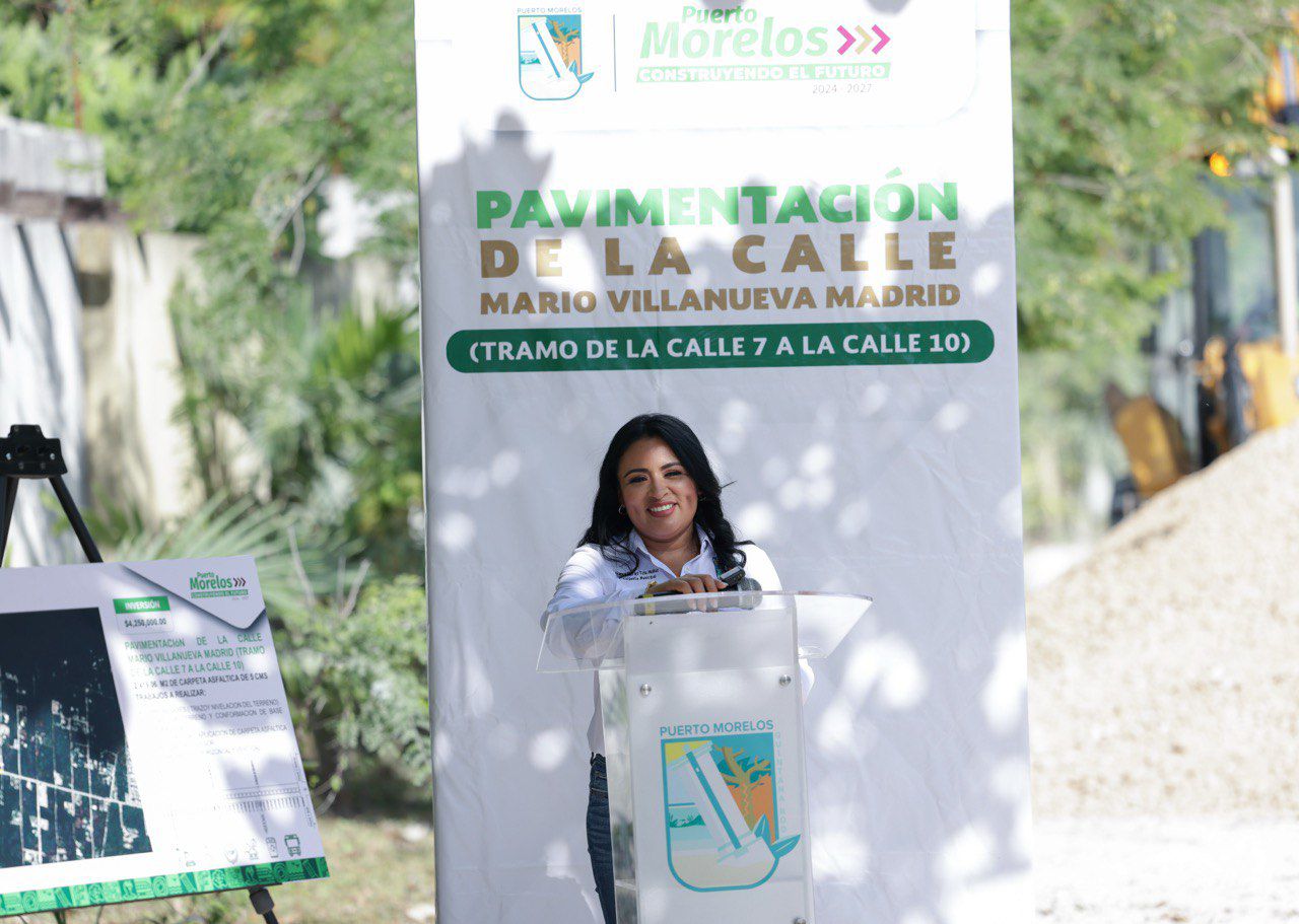 PUERTO MORELOS.- Con la firme convicción de transformar realidades y cumplir la palabra empeñada, la presidenta municipal Blanca Merari Tziu Muñoz dio hoy el banderazo de inicio a la pavimentación de la calle Mario Villanueva Madrid, en su segunda etapa que consiste en el tramo entre calles 7 y 10, una obra prioritaria para cientos de familias de la zona urbana de Puerto Morelos.