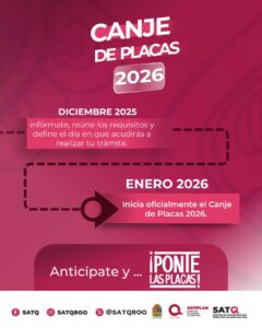 CHETUMAL.- El Servicio de Administración Tributaria de Quintana Roo (SATQ), a través de la Secretaría de Finanzas y Planeación (Sefiplan), invitó a la ciudadanía a anticipar su trámite con motivo del Canje de Placas 2026, el cual dará inicio de manera oficial en enero de 2026.