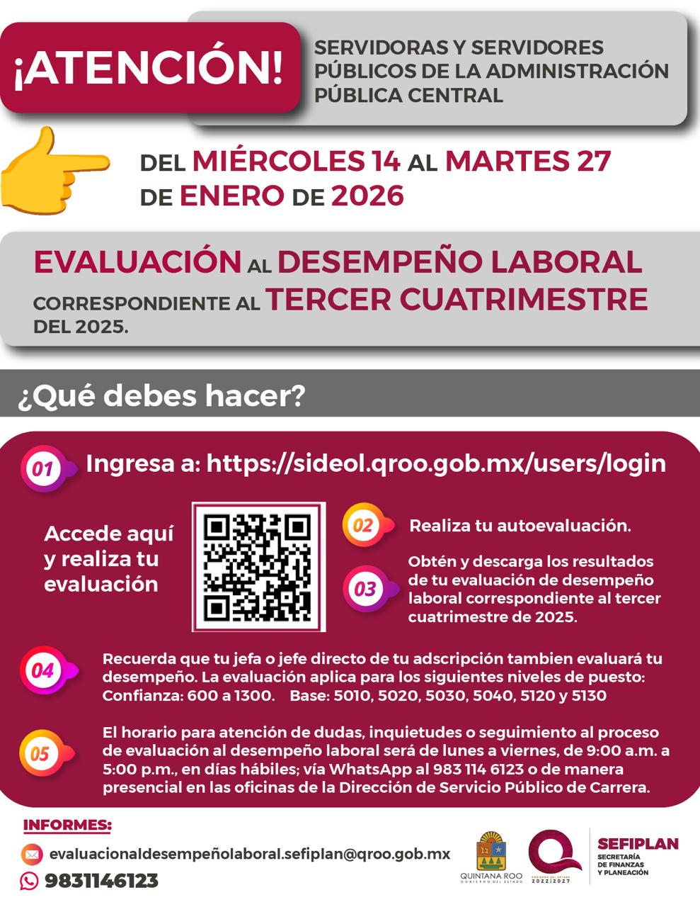 CHETUMAL.- La Secretaría de Finanzas y Planeación (Sefiplan) informó que, del 14 al 27 de enero de 2026, las servidoras y los servidores públicos de la Administración Pública Central deberán realizar su Autoevaluación del Desempeño Laboral, correspondiente al tercer cuatrimestre de 2025.