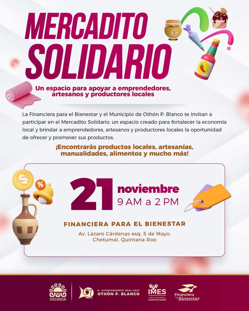 El “Mercadito Solidario” tendrá lugar el viernes 21 de noviembre, de 9 de la mañana a 2 de la tarde, en las instalaciones de la Financiera para el Bienestar, ubicada en la avenida Lázaro Cárdenas con esquina 5 de Mayo.