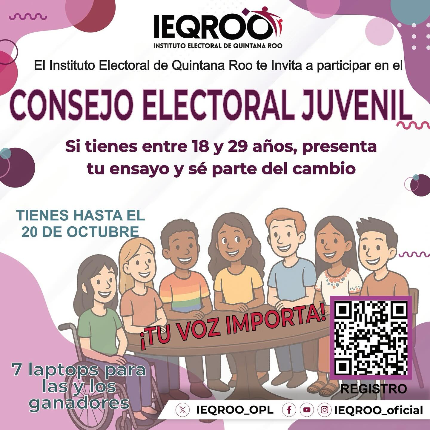 CHETUMAL.- El Instituto Electoral de Quintana Roo (IEQROO) convoca a las juventudes del estado, de entre 18 y 29 años de edad, a participar en la conformación del Consejo Electoral Juvenil del Estado de Quintana Roo 2025 (CEJ 2025), un espacio creado para impulsar la participación ciudadana y el liderazgo juvenil en temas democráticos y electorales.