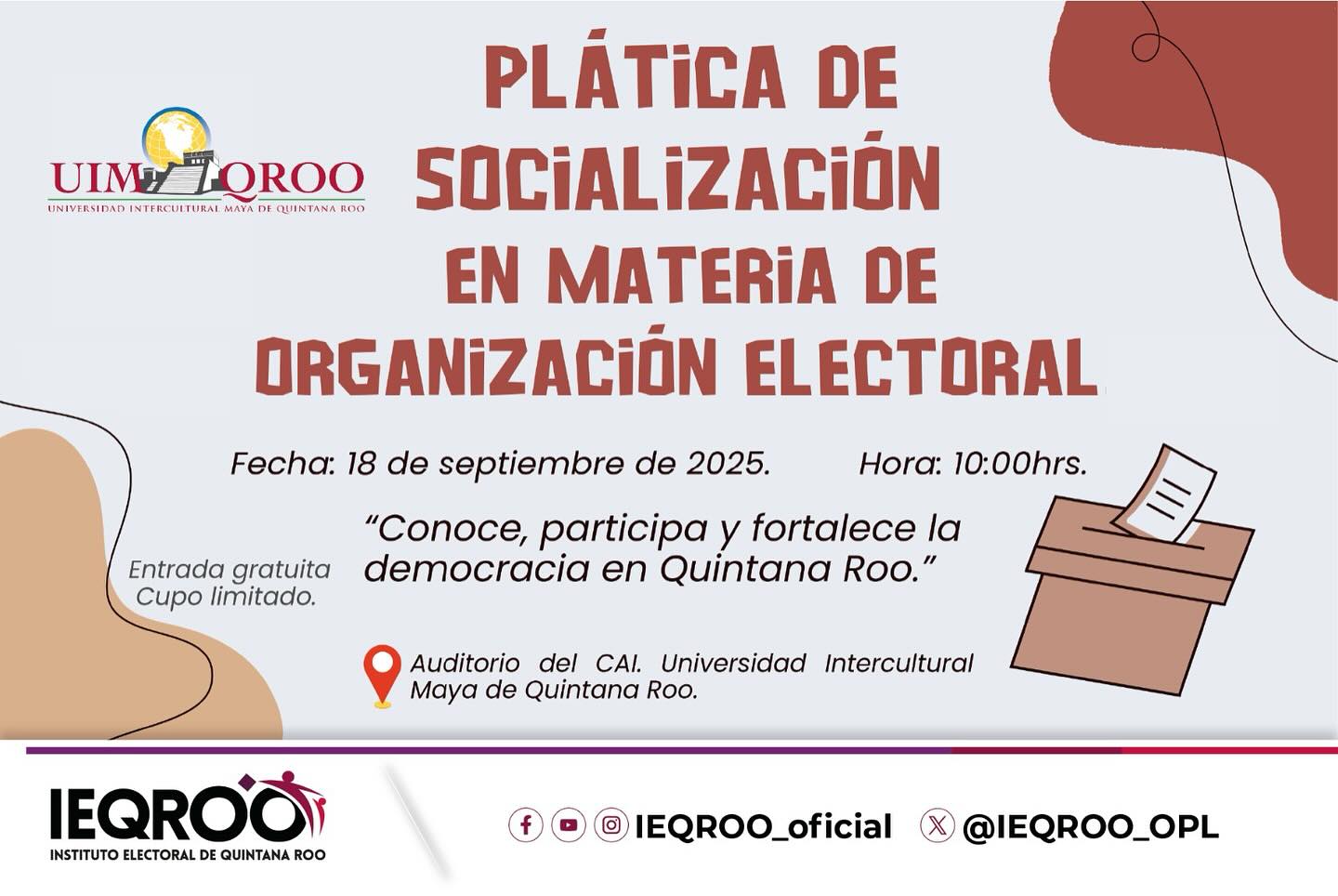 CHETUMAL.- El Instituto Electoral de Quintana Roo (IEQROO) convoca a la ciudadanía a participar en la “Plática de socialización en materia de organización electoral”, que se llevará a cabo el próximo 18 de septiembre de 2025 a las 10:00 horas en el auditorio del CAI de la Universidad Intercultural Maya de Quintana Roo.