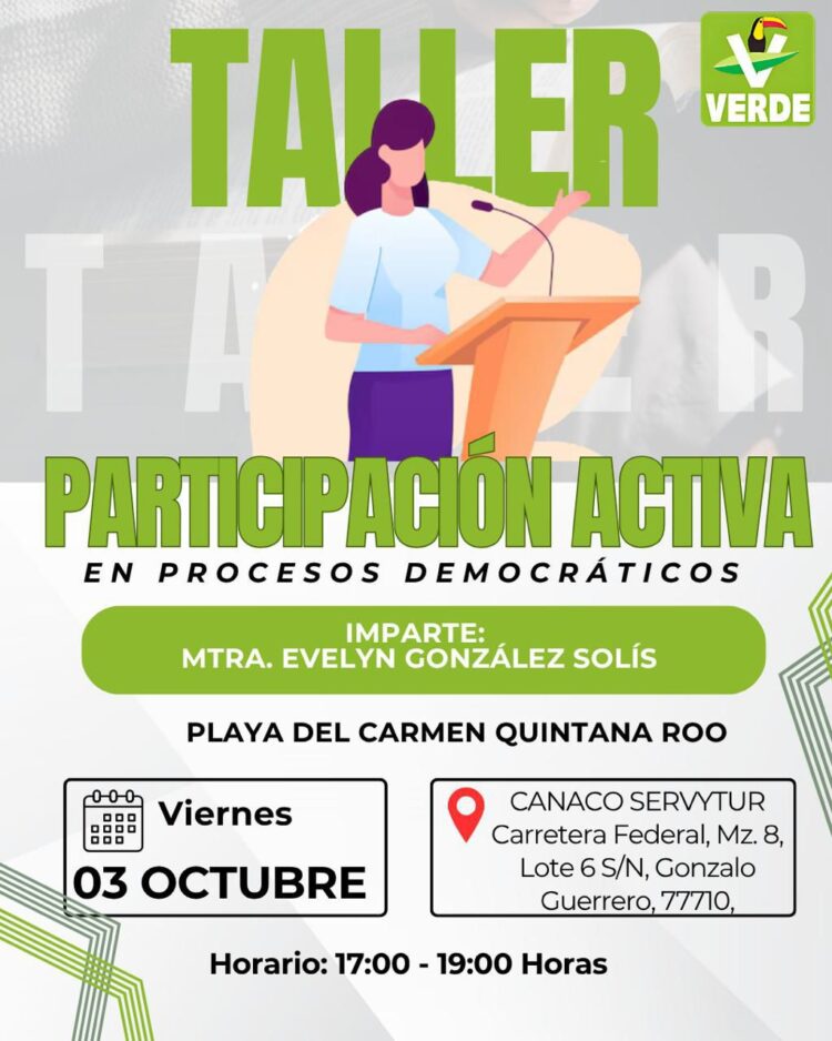 PLAYA DEL CARMEN.-  El Partido Verde Ecologista de México en Quintana Roo invita a la ciudadanía al taller “Participación Activa en Procesos Democráticos”, que se realizará el próximo viernes 3 de octubre a las 17:00 horas en las instalaciones de la Canaco Servytur, ubicadas en Carretera Federal Mz 8, Lote 6 S/N, colonia Gonzalo Guerrero.