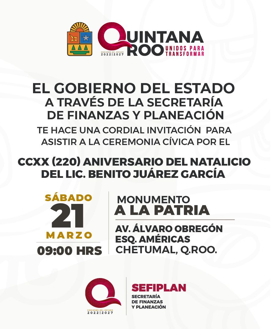 CHETUMAL.- El Gobierno del Estado, a través de la Secretaría de Finanzas y Planeación (Sefiplan), invitó a la ciudadanía a participar en la ceremonia cívica con motivo del 220 aniversario del natalicio de Benito Juárez García, una de las figuras más representativas de la historia nacional.