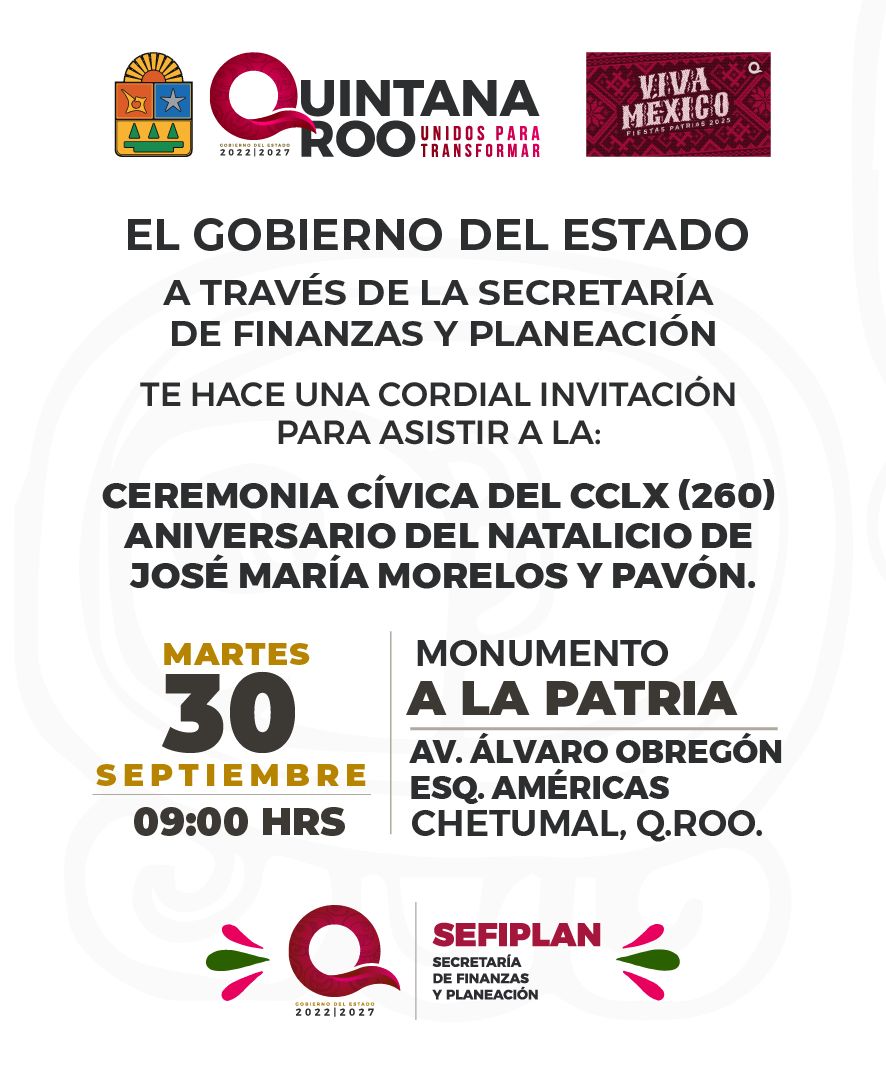 CHETUMAL.- La Secretaría de Finanzas y Planeación de Quintana Roo (Sefiplan) invita a la ciudadanía a participar en la Ceremonia Cívica conmemorativa del 260° aniversario del natalicio de José María Morelos y Pavón, uno de los grandes héroes de la historia de México.