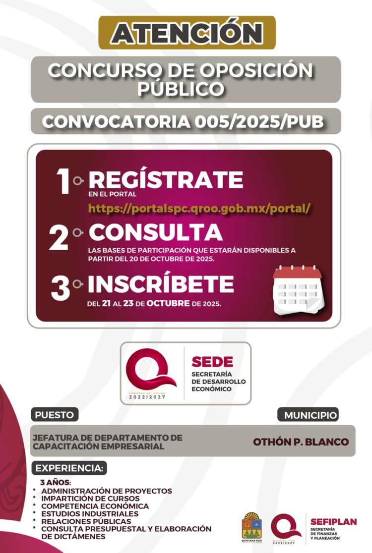 CHETUMAL.- El Gobierno del Estado de Quintana Roo, a través de la Secretaría de Finanzas y Planeación (SEFIPLAN), emitió la Convocatoria 005/2025/PUB del Concurso de Oposición Público, para cubrir la vacante disponible en la Secretaría de Desarrollo Económico (SEDE).