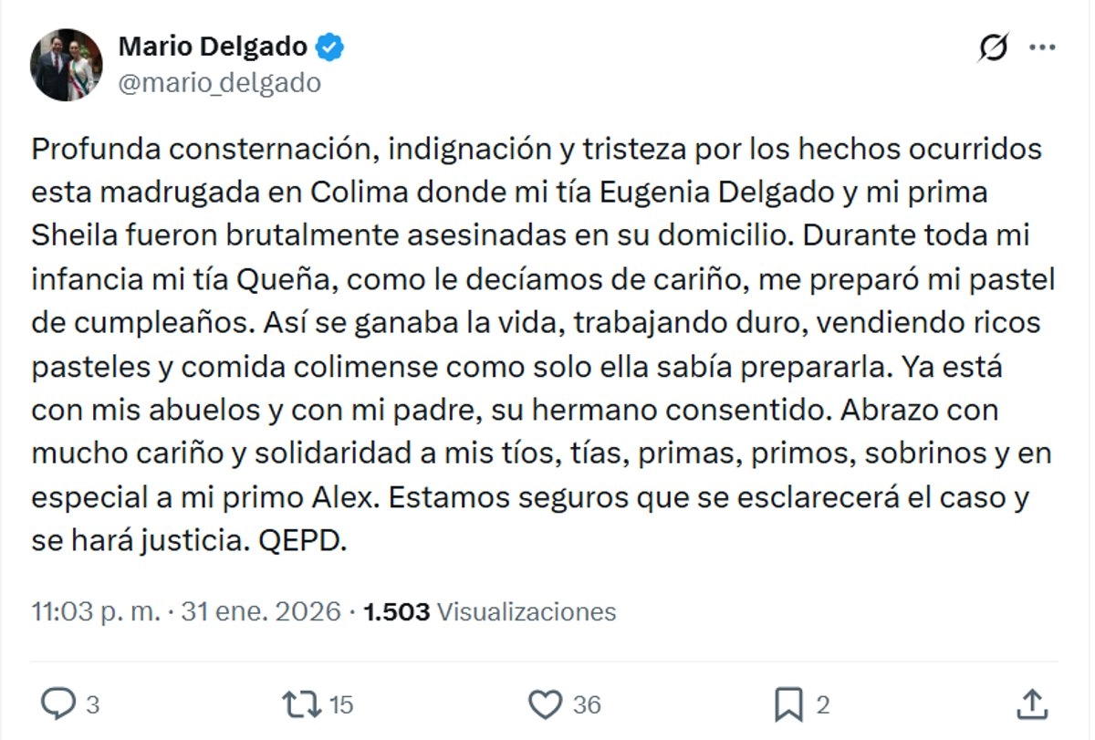 CDMX.- Esta noche, Mario Delgado, titular de la Secretaría de Educación Pública (SEP) expresó su “profunda consternación, indignación y tristeza por los hechos ocurridos esta madrugada en Colima donde mi tía Eugenia Delgado y mi prima Sheila fueron brutalmente asesinadas en su domicilio.”