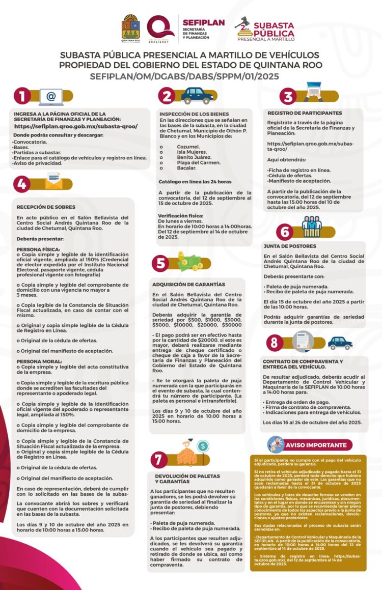 De acuerdo con la convocatoria, las y los interesados podrán consultar las bases, el catálogo de vehículos y toda la información necesaria a través de la página oficial sefiplan.qroo.gob.mx/subasta-qroo.