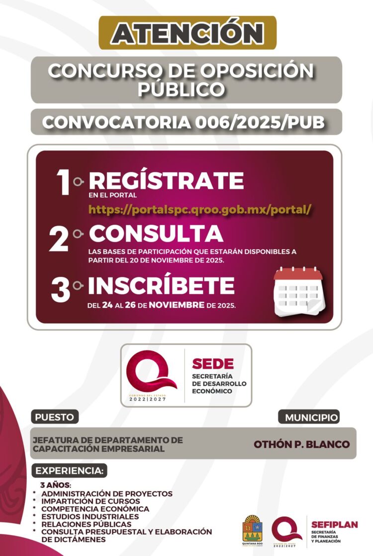 CHETUMAL.- El Gobierno del Estado de Quintana Roo abrió un nuevo proceso de Concursos de Oposición Público para ocupar plazas en la administración estatal, con el objetivo de fortalecer la transparencia y profesionalización del servicio público. La Secretaría de Finanzas y Planeación (SEFIPLAN) informó que, en esta ocasión, se ofrecen vacantes en la Secretaría de Desarrollo Económico (SEDE) y en la Comisión de Búsqueda de Personas del Estado de Quintana Roo (CBPEQROO).
