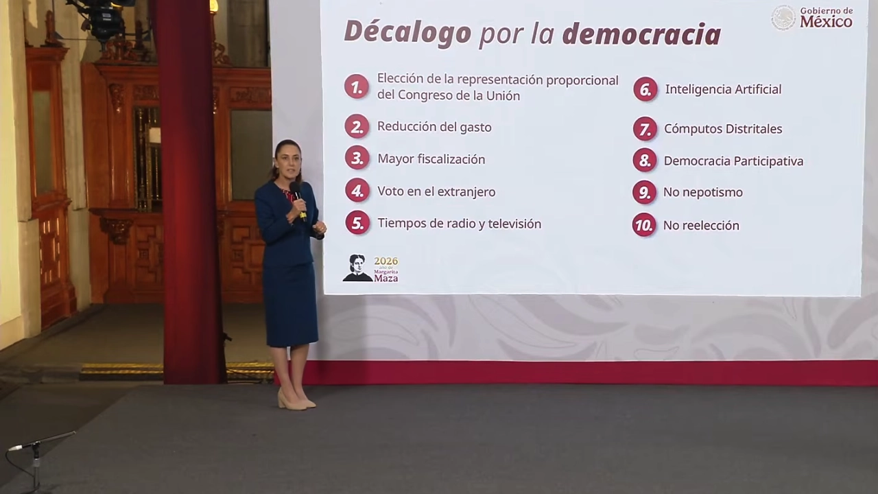Además, durante su conferencia de prensa mañanera, llamó a la propuesta como “Decálogo por la Democracia” y reiteró que se trata de una reforma constitucional integrada por diez puntos que, dijo, responden a compromisos adquiridos con la ciudadanía, particularmente en lo referente a las listas plurinominales y al costo de las elecciones.