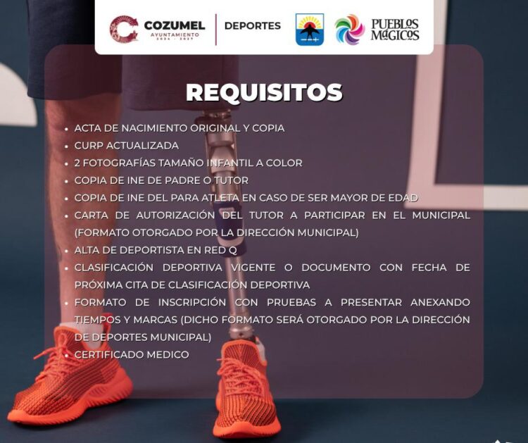 COZUMEL.- El gobierno municipal que encabeza José Luis Chacón Méndez, a través de la dirección de Deportes, abrió la convocatoria para el deporte adaptado en las disciplinas de natación y atletismo de campo y pista, con el propósito de integrar la delegación que representará a Cozumel en los Paranacionales CONADE, etapa estatal 2025.