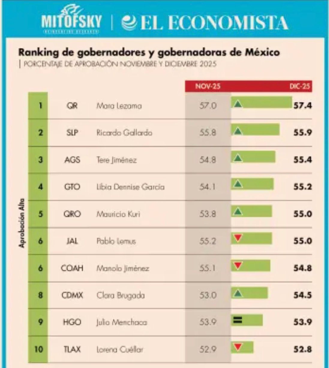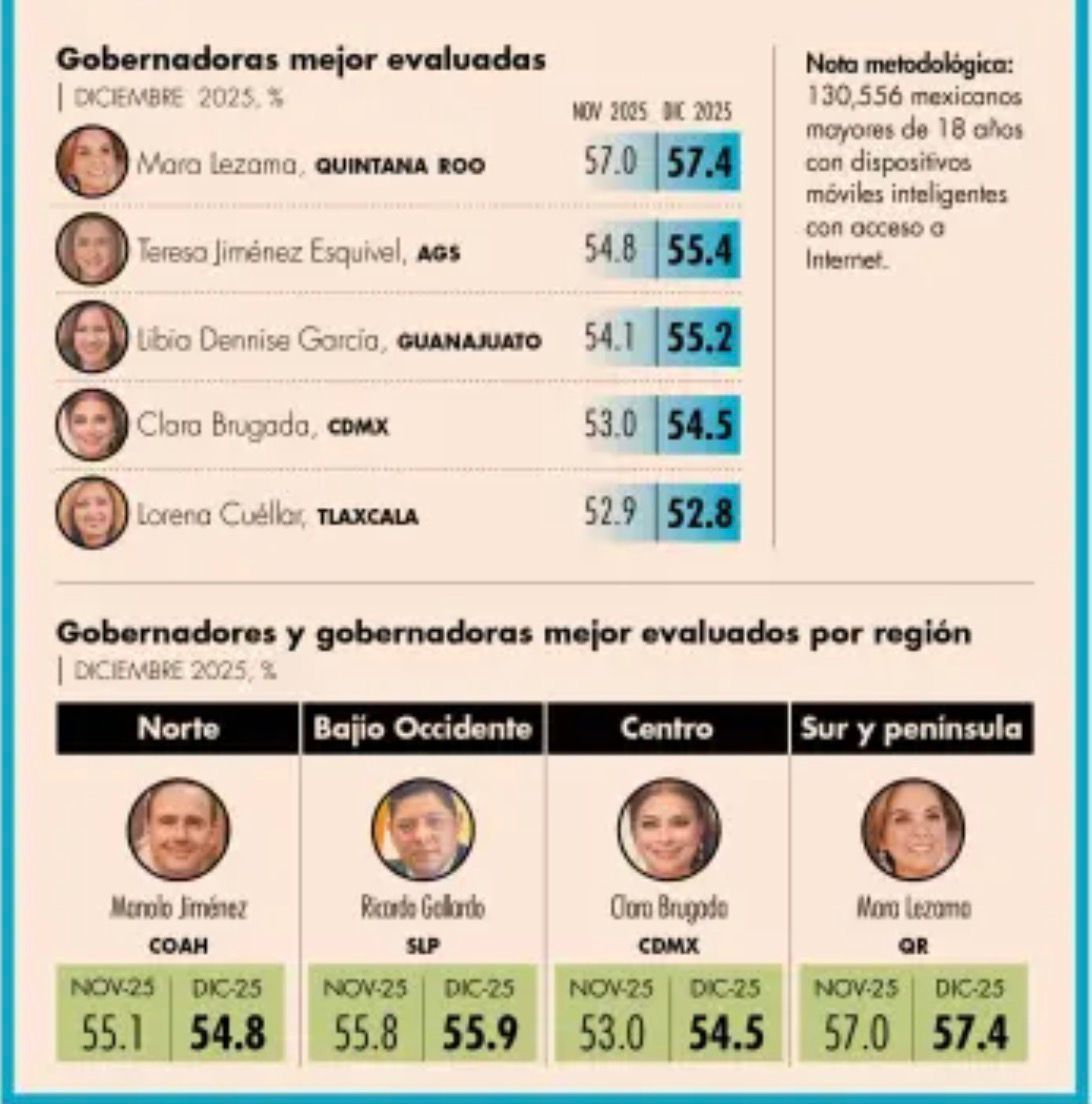 Un dato destacado del ranking es que el Top Ten se integró de manera paritaria, con cinco mujeres y cinco hombres, reflejando una evaluación ciudadana equilibrada en términos de género. Sin embargo, sólo una mandataria —Mara Lezama— logró sostener durante todo 2025 niveles de aprobación consistentemente superiores al promedio nacional.