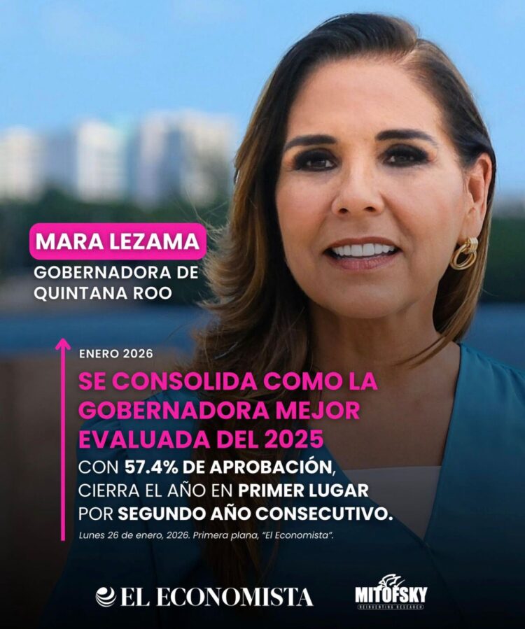 CANCÚN.- La gobernadora de Quintana Roo, Mara Lezama, cerró diciembre de 2025 como la mandataria estatal mejor evaluada del país, de acuerdo con el más reciente Ranking de Gobernadores y Gobernadoras de México elaborado por Consulta Mitofsky para el periódico El Economista.