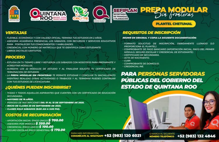 CHETUMAL.- La Secretaría de Finanzas y Planeación (Sefiplan) hizo un llamado a las y los trabajadores del Gobierno del Estado, así como a personas mayores de 18 años con certificado de secundaria, a inscribirse en la Prepa Modular Sin Fronteras, un programa flexible y con validez oficial que permite concluir el bachillerato en dos años.