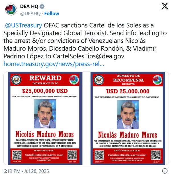 La DEA difundió el anuncio a través de su cuenta oficial en la red social X, donde reiteró el llamado a proporcionar información sobre Maduro, Cabello y el ministro de Defensa, Vladimir Padrino López, todos identificados como miembros del “Cártel de los Soles”, organización criminal señalada por Estados Unidos como Organización Terrorista Global Especialmente Designada.
