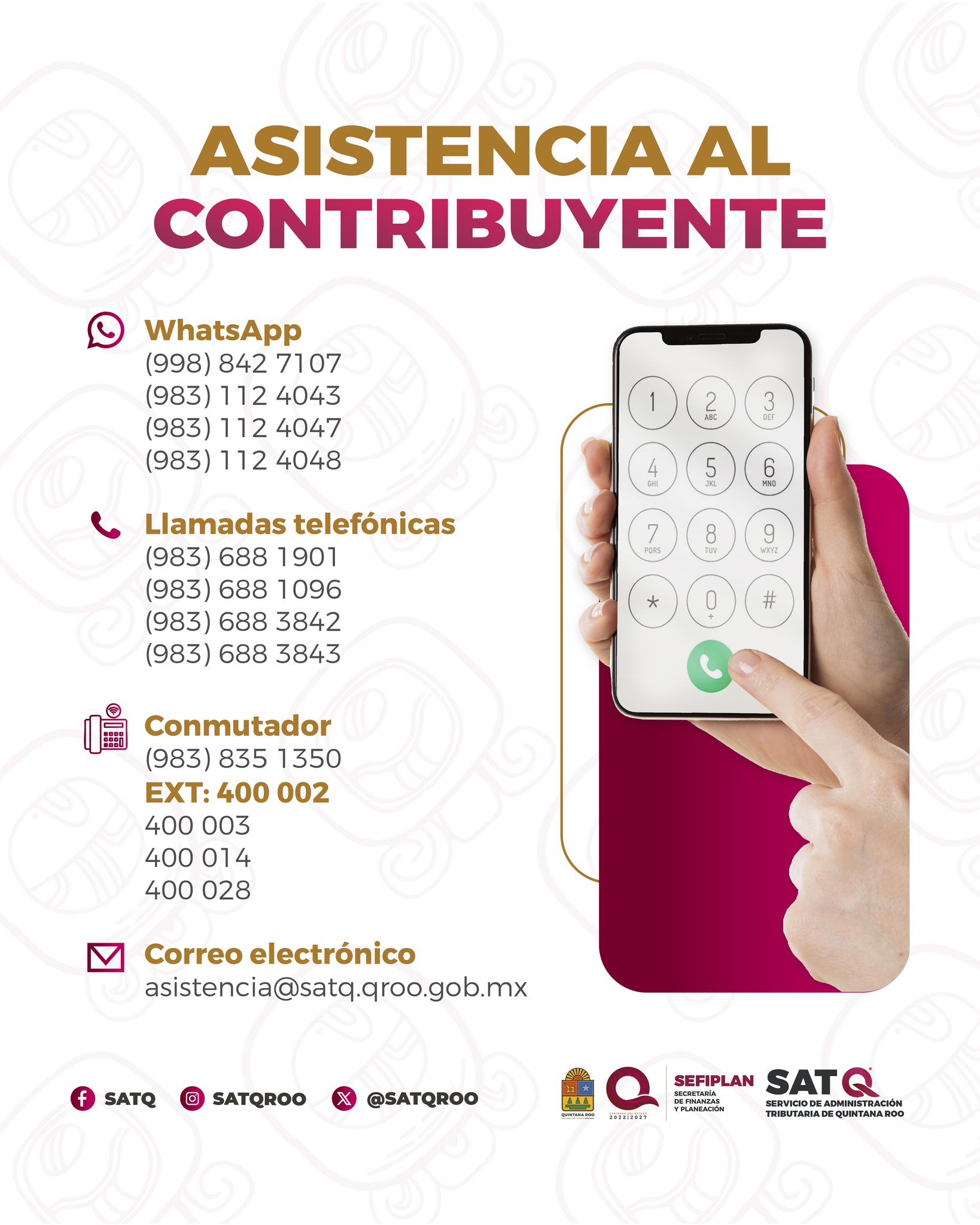 Los contribuyentes pueden comunicarse por WhatsApp a los números: (998) 842 7107, (983) 112 4043, (983) 112 4047 y (983) 112 4048. También están disponibles las líneas telefónicas: (983) 688 1901, 688 1096, 688 3842 y 688 3843.
