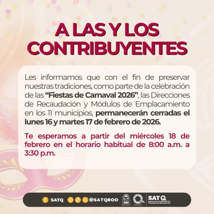 CHETUMAL.- La Secretaría de Finanzas y Planeación (Sefiplan) informó que, con motivo de la celebración de las “Fiestas de Carnaval 2026”, las Direcciones de Recaudación y los Módulos de Emplacamiento en los 11 municipios del estado permanecerán cerrados los días lunes 16 y martes 17 de febrero.