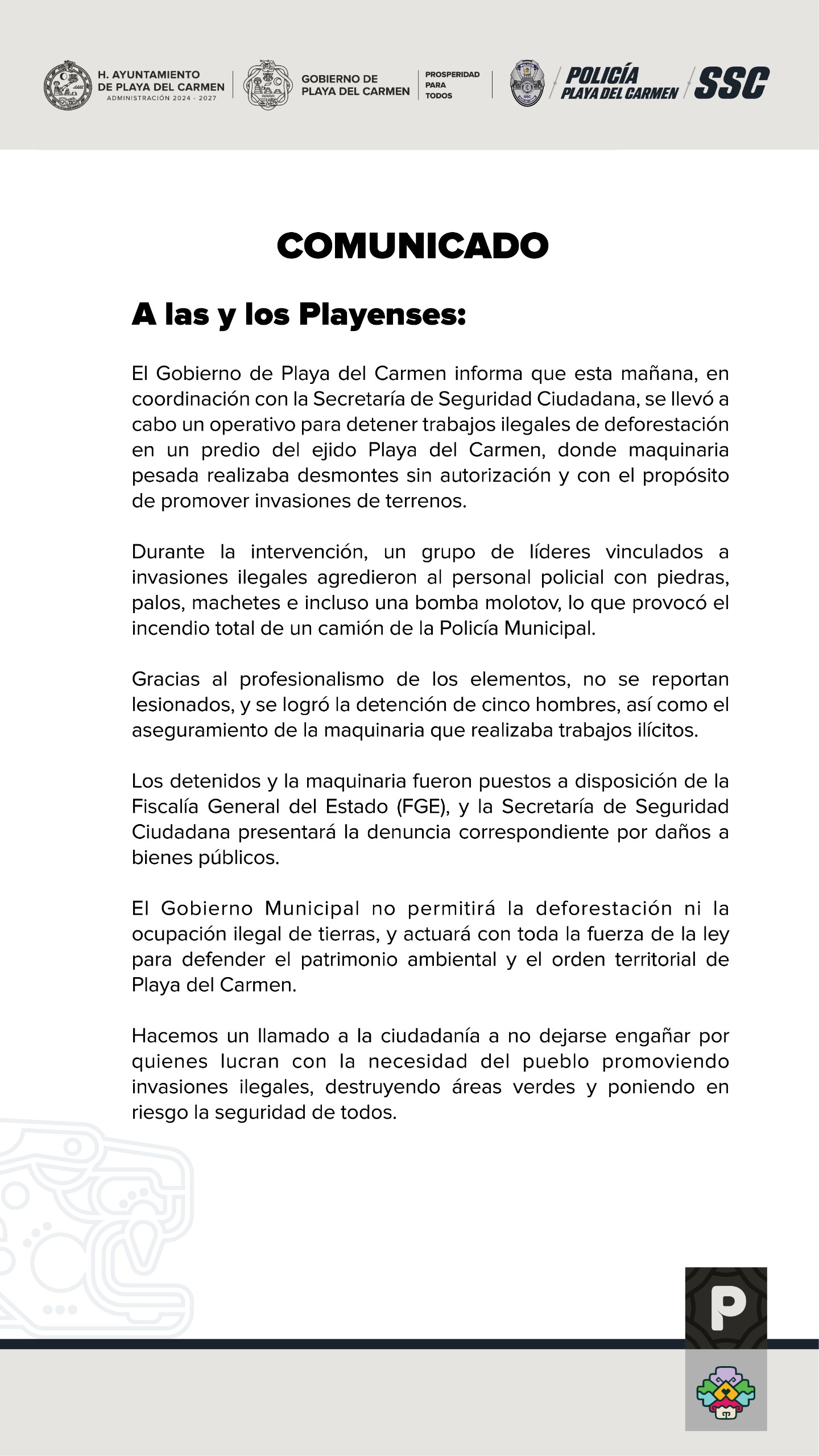 El Gobierno Municipal no permitirá la deforestación ni la ocupación ilegal de tierras, y actuará con toda la fuerza de la ley para defender el patrimonio ambiental y el orden territorial de Playa del Carmen.