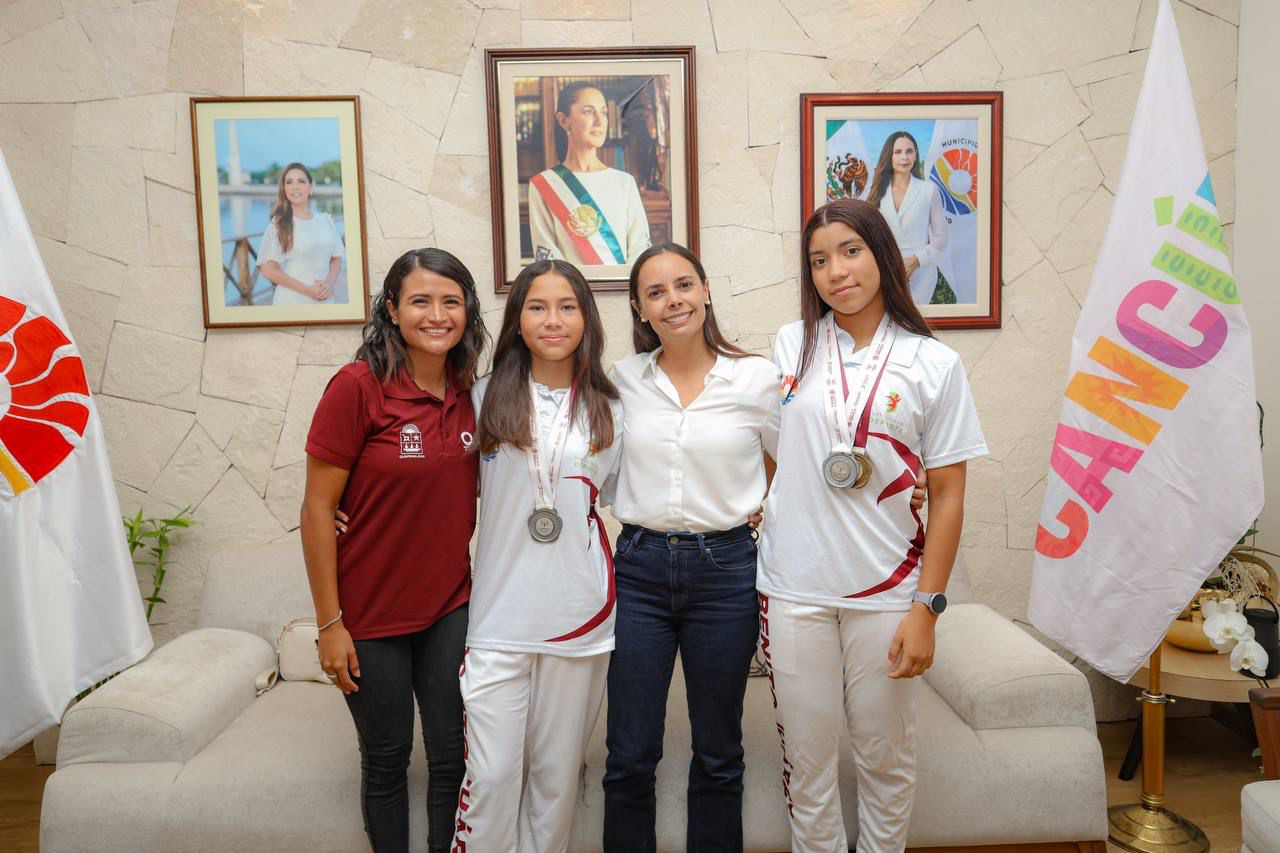 CANCÚN.- La Presidenta Municipal, Ana Paty Peralta, recibió en su despacho a las atletas representantes del municipio de Benito Juárez, Victoria Alejandra Marín Flores y Victoria Gameba García Güemez, ganadoras de medallas en la Olimpiada Nacional CONADE 2025, realizada el pasado junio en Guadalajara, Jalisco, así como a su entrenadora Lesly Yamily Gómez Caballero.