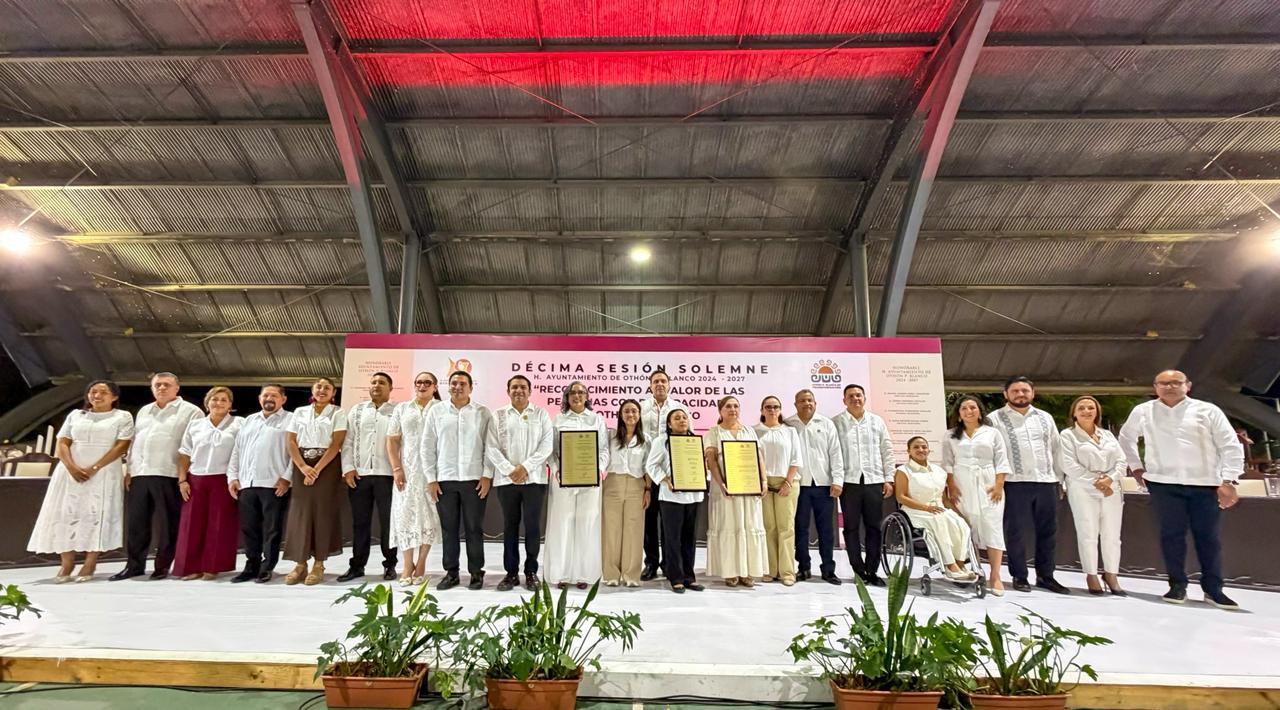 CHETUMAL.- En el marco de la Décima Sesión Solemne del H. Ayuntamiento de Othón P. Blanco, la presidenta municipal Yensunni Martínez Hernández, acompañada del síndico, regidoras y regidores, entregó el Reconocimiento al Valor de las Personas con Discapacidad a Bertha Peña Ake, Tania Guadalupe Solís Covarrubias y a la Fundación Siiniko’ob presidida por Mercedes Pérez Loeza.