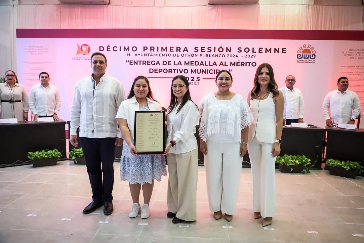 CHETUMAL.- La presidenta municipal de Othón P. Blanco, Yensunni Martínez Hernández, extendió su más sincera felicitación, reconocimiento y admiración a la joven Yareni Miranda Chab Quintal, orgullosa galardonada de la Medalla al Mérito Deportivo Municipal 2025.
