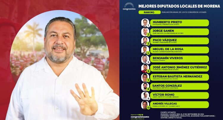 La lista de los diez legisladores más destacados, basada en el desempeño de los 32 congresos locales, posiciona al Diputado de la Transformación de Quintana Roo, Jorge Sanén, como Negociador clave para la sostenibilidad turística y protección de la Riviera Maya con perspectivas indígenas con más de 200 intervenciones impactando en 50 mil familias con ecoturismo inclusivo y reducción en un 10% de pobreza en comunidades mayas.
