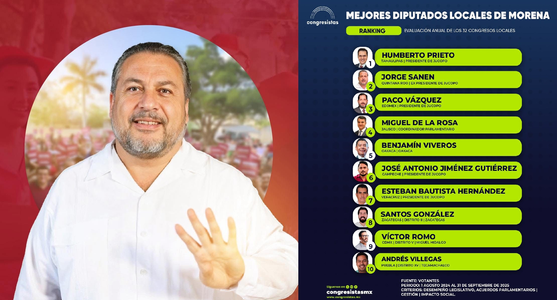 La evaluación cubre el periodo del 1 de agosto de 2024 al 31 de septiembre de 2025. La fuente de los datos para la clasificación fue realizada por Votantes, lo que sugiere un componente de percepción ciudadana en la medición, además del análisis técnico del trabajo legislativo.